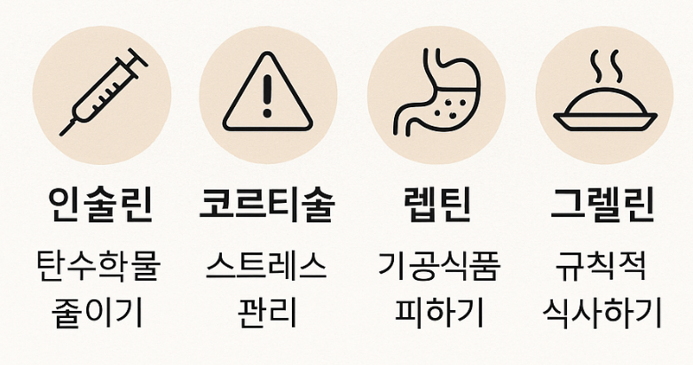 | 렙틴 | 포만감 신호, 저항성 시 과식 | 숙면, 단백질·섬유질 식사, 가공식품↓ |