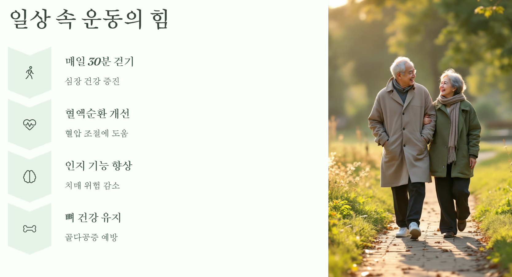- 이유: 근육량과 심폐 기능은 나이에 따라 자연히 감소합니다. 운동은 이를 늦추고, 체력과 면역력을 높여줍니다.